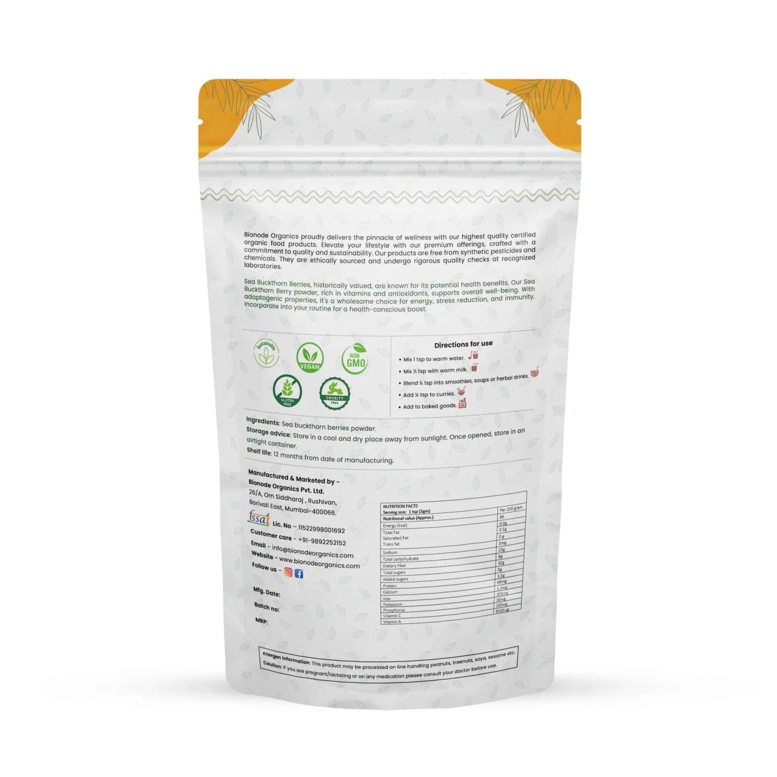 Bionode Organic Sea Buckthorn Berries Powder is a nutrient-dense superfood derived from premium sea buckthorn berries, carefully processed to preserve natural vitamins and antioxidants. Rich in vitamin C, omega fatty acids, and carotenoids, this powder supports immune health, skin vitality, and overall wellness. Certified organic and free from additives, it blends seamlessly into smoothies, yogurt, beverages, and recipes. Each serving delivers the concentrated goodness of sun-ripened berries in convenient powder form. Ideal for health-conscious individuals seeking natural nutrition and plant-based wellness solutions.